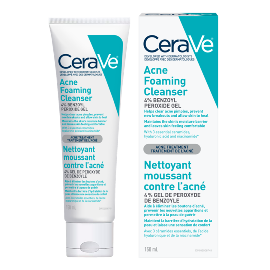 CeraVe Acne Foaming Cleanser with 4% benzoyl peroxide, helps clear acne pimples, prevent new breakouts, and allow skin to heal. This gentle yet effective acne cleanser, formulated with 3 essential ceramides, hyaluronic acid and niacinamide*, helps maintain the skin’s moisture barrier and retain skin’s natural moisture. This non-comedogenic, fragrance-free face wash instantly dissolves dirt and excess oil to cleanse face, without stripping the skin of its natural moisture. Skin will feel softer, smoother, more clarified and comfortable while reducing acne, without dryness or flaking.