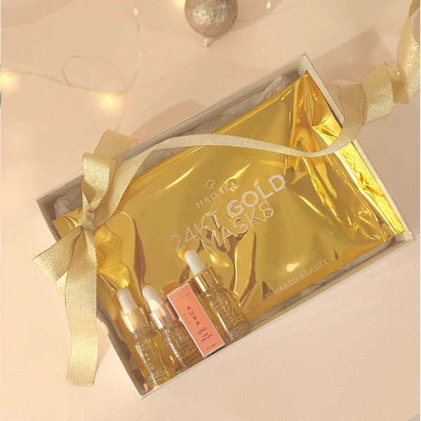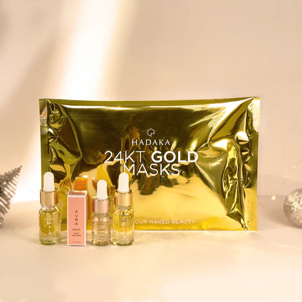 Introducing the ultimate pampering experience with the Hadaka 24KT Gold Holiday Kit! Indulge in luxury with the 24KT Gold Collagen & HA Trio of masks (face, eyes and lips) that will leave your skin looking radiant and youthful. Enriched with the power of Hyaluronic Acid, Collagen, and Vitamin A these masks provide deep hydration and firmness to your skin.